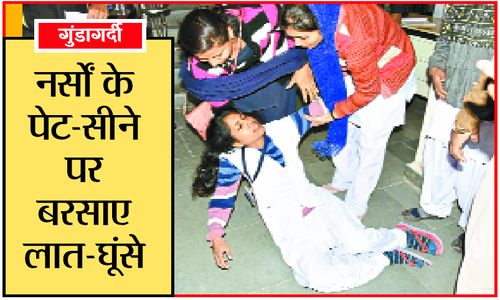 रतलाम। हर दिन की तरह सुबह हॉस्पिटल नर्स अपनी साथी नर्स के साथ बैठी थी, तभी शैलेष नामक युवक आया और गाली-गलौज कर धमकी दी कि हॉस्पिटल आना बंद करवा दूंगा और हॉस्पिटल बंद करवा दूंगा। नर्स बुलबुल मना करने गई तो उसकी कॉलर पकड़कर मुक्का मार दिया और हाथ मोड़ दिया। साथी नर्स बुलबुल, संजना, नीलम बचाने आई तो उन पर भी लात-घूंसे बरसाना शुरू कर दिए। बुलबुल को नीचे गिराकर पेट व छाती पर लात मारी। दरवाजा तोड़ भी तोड़ दिया। हास्पिटल में रजिस्ट्रेशन काउंटर पर बैठने वाले युवक रामगढ़ निवासी नितिन शर्मा के बीच-बचाव करने पर उसके साथ भी मारपीट की है। उसके हाथ पर चोट आई है। ट्रस्टी राजाराम और दीपक पुरोहित बीच-बचाव करने आए तो उनसे भी गाली-गलौज की।