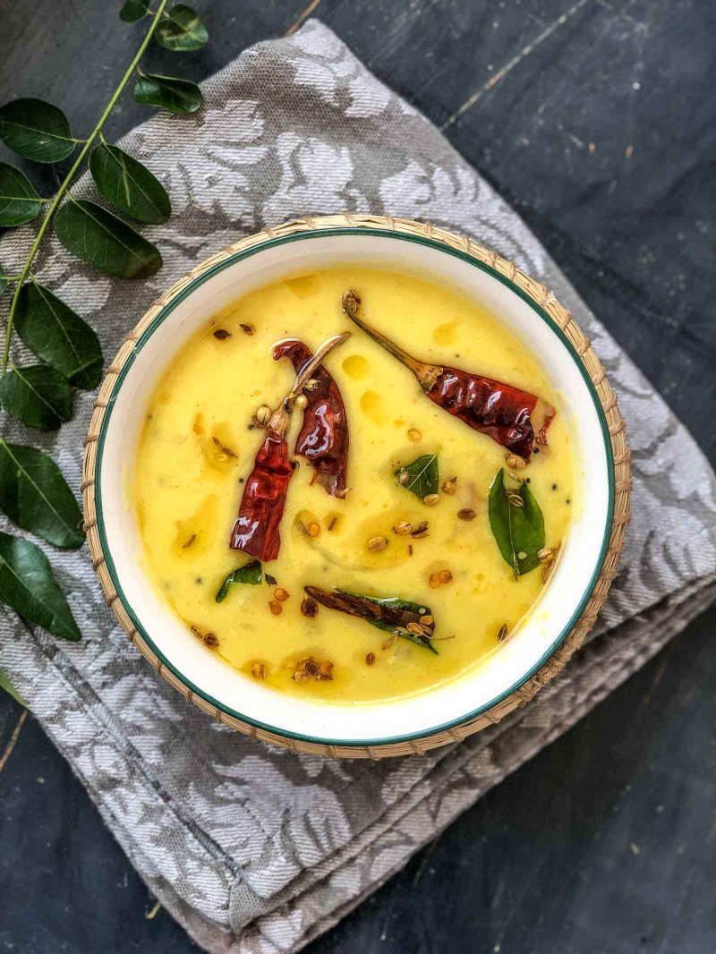 सर्वप्रथम अच्छी तरह फेटें हुए दही में एक कप पानी डालकर मिला लें। अब एक कटोरे में बेसन को छान लें और उसमें नमक, चीनी तथा 2 कप थोड़ा-थोड़ा पानी डालकर मिला लें अब इसमें पहले से फेंटा हुआ दही मिला लें। इसके बाद एक कढ़ाई में तेल गर्म करके उसमें जीरा, राई, खड़ी लाल मिर्च और हींग डालकर कुछ सेकेंड भूने। फिर करी पत्ते डालकर कुछ सेकेंड और भूने। इसके बाद अदरक-हरी मिर्च का पेस्ट डालकर 25 मिनट के लिए भूने तथा बेसन और दही के घोल को कढ़ाई में डाल कर अच्छे से मिला लेंगे। इसे करछी से तब तक चलाएं जब तक एक उबालना आ जाए।