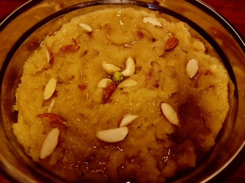 • अब गैस पर एक पैन रखकर उसमें आधे से ज्यादा घी डाल देंगे। घी पिघल जाने पर पैन में सूजी डालेंगे और इसका रंग सुनहरा-भूरा होने तक कलछी से चलाते हुए मध्यम आंच पर भून लेंगे। जब सूजी भुन जाएगी तो पैन में घी अलग होने लगेगा तथा सूजी में से खुशबू आने लगेगी अब गैस बंद कर सूजी को एक प्लेट में निकाल लेंगे।