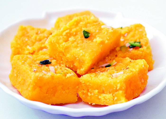 दाल को धोकर धूप में सुखा लें। कड़क हो जाने पर मिक्सी में दरदरा पीस लें। पिसी दाल में दूध व 2 बड़े चम्मच घी मिलाकर आधा घंटे के लिए रख दें। अब हल्के हाथ से अच्छी तरह मिलाएं और मोटे छेद की छलनी से छान लें। खोये को मसल लें या कस लें। शेष घी को कड़ाही में गरम करें। दाल को घी में डालकर मंद आंच पर भूनें। जब भुनने की सुगंध आने लगे तब आंच से उतार लें। खोया व नारियल का लच्छा भी गुलाबी होने तक मंद आंच पर भूनें। भुनी दाल, खोया, नारियल लच्छा व कटे बादाम मिला लें। चीनी की चाशनी बनाएं। चाशनी में केसर व पीला रंग भी डाल दें। तैयार मिश्रण चाशनी में डालकर चलाएं। जब मिश्रण कड़ाही छोडऩे लगे तब चिकनाई लगी ट्रे में जमा दें। ऊपर से कटे पिस्ता व कदे बादाम बुरक दें। चाकू से मनचाहे आकार में काट लें।