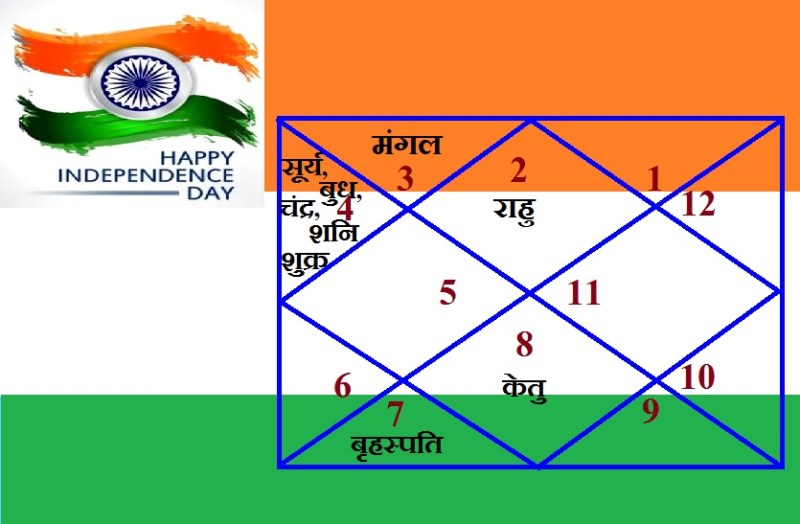 स्वतंत्र भारत की जन्म कुंडली में वृषभ लगन में राहु की मौजूदगी के बीच सबसे विशेष व दुर्लभ योग की बात करें तो कुंडली का तृतीय भाव में कर्क राशि में सूर्य, चंद्र, शनि, बुध, शुक्र ये पांच ग्रह बैठकर पंचग्रही योग बना रहे हैं। यह पराक्रम व शक्ति का भाव है भारत की कुंडली का तीसरा भाव बहुत बलवान है। वहीं रोग व शत्रु भाव में तुला राशि में गुरु विराजमान है। जबकि सप्तम भाव में वृश्चिक राशि में केतु बैठे है। जबकि धन भाव में मिथुन राशि में मंगल विराजमान है।