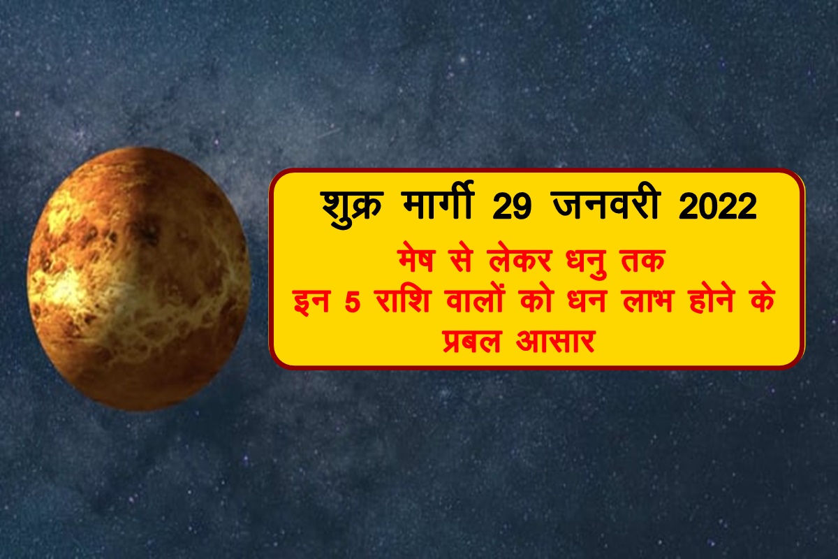 Shukra Margi 2022: शुक्र ग्रह को प्रेम, आकर्षण, धन, समृद्धि और ज्ञान का कारक ग्रह माना जाता है। ये वृषभ और तुला राशि का स्वामी है। कन्या राशि में दुर्बल होता है और मीन राशि में उच्च का होता है। सरल शब्दों में मार्गी होने का अर्थ समझे तो किसी ग्रह का उल्टी अवस्था से सीधी अवस्था में आ जाना ग्रह का मार्गी होना कहलाता है। शुक्र 29 जनवरी को दोपहर 3 बजे के करीब धनु राशि में अपनी सीधी चाल शुरू करेंगे। सभी 12 राशियों पर इनका प्रभाव पड़ेगा। लेकिन 5 राशियों के लिए ये चाल सबसे शुभ साबित होगी।