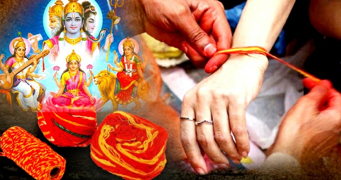 धर्म ग्रंथों की मान्यता के अनुसार कलावा बांधने से त्रिदेव- ब्रह्मा, विष्णु व महेश एवं त्रिदेवियां- लक्ष्मी, पार्वती व सरस्वती की असीम कृपा प्राप्त होती है। कलावा कच्चे सूत के धागे से बना होता है। शास्त्रों के अनुसार कलावा बांधने की परंपरा की शुरुआत देवी लक्ष्मी और राजा बलि ने की थी। कलावा को रक्षा सूत्र भी कहा जाता है, माना जाता है कि कलाई पर इसे बांधने से जीवन पर आने वाले संकट से रक्षा होती है। धार्मिक महत्व रखने के साथ साथ कलावा बांधना वैज्ञानिक तौर पर भी काफी लाभप्रद है।