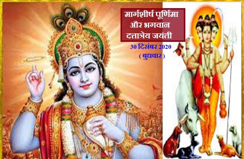 मार्गशीर्ष पूर्णिमा 30 दिसंबर, 2020 (बुधवार) के दिन भगवान दत्तात्रेय जयंती भी है। सनातन धर्म के त्रिदेव ब्रह्मा, विष्णु और शंकर की प्रचलित विचारधारा के विलय के लिए ही भगवान दत्तात्रेय ने जन्म लिया था, इसीलिए उन्हें त्रिदेव का स्वरूप भी कहा जाता है। दत्तात्रेय को शैवपंथी शिव का अवतार और वैष्णवपंथी विष्णु का अंशावतार मानते हैं। दत्तात्रेय को नाथ संप्रदाय की नवनाथ परंपरा का भी अग्रज माना है। यह भी मान्यता है कि रसेश्वर संप्रदाय के प्रवर्तक भी दत्तात्रेय थे। भगवान दत्तात्रेय से वेद और तंत्र मार्ग का विलय कर एक ही संप्रदाय निर्मित किया था।