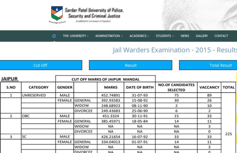 Rajasthan Jail Prahari Final Result राजस्थान जेल प्रहरी भर्ती का अंतिम चरण भी समाप्त हो चूका है। पात्र अभ्यर्थियों का अंतिम वरीयता के आधार पर चयन कर लिया गया है। चिकित्सा परिक्षण पश्चात वेटिंग लिस्ट से भी अभ्यर्थी बुलाये जा सकते हैं। परिणामों में बड़ी दिलचस्प बात है की अन्य पिछड़ा वर्ग और सामान्य वर्ग के अभ्यर्थियों की कटऑफ मार्क्स में केवल एक मार्क्स का ही अंतर हैं। इतना ही नहीं अनुसूचित जनजाति की कटऑफ अनुसूचित जाती की कटऑफ से ज्यादा है। इसबार रिक्त पदों के अनुसार मेरिट वरीयता में बदलाव किया गया है। जहाँ कुल रिक्त पदों पर उसके बराबर या उससे ज्यादा अभ्यर्थी उत्तीर्ण किये जाते हैं। या अन्य वेटिंग लिस्ट जारी की जाती हैं। लेकिन राजस्थान जेल प्रहरी भर्ती कुछ अलग देखने को मिला है। यहाँ अन्य पिछड़ा वर्ग के जयपुर से कुल 44 पदों के लिए सिर्फ 29 को ही वरीयता में लिया गया है। अजमेर से 28 पदों के लिए सिर्फ 12 अभ्यर्थियों को ही वरीयता मिली हैं। जोधपुर में भी यही हाल है 17 पदों के लिए 7 अभ्यर्थियों को उत्तीर्ण किया गया है। कोटा में 35 पदों के लिए 24 अभ्यर्थियों को उत्तीर्ण किया गया है।