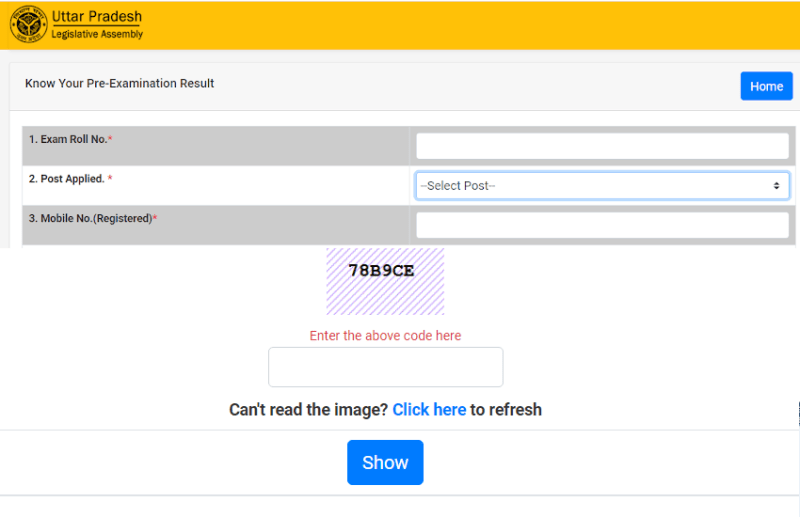 उम्मीदवार यूपी विधान सभा की वेबसाइट पर विजिट करके भर्ती से सम्बन्धित लिंक पर क्लिक करके भर्ती पोर्टल पर विजिट कर सकते हैं। इसके बाद भर्ती पोर्टल पर परिणामों से सम्बन्धित लिंक पर क्लिक करके रिजल्ट पेज पर जा सकते हैं। रिजल्ट पेज पर उम्मीदवारों को अपना रोल नंबर और मोबाइल नंबर भरना होगा और आवेदित पद का चयन ड्रॉप-डाऊन में से करना होगा। सभी विवरणो को सबमिट करने के बाद उम्मीदवार अपना परिणाम स्क्रीन पर देख पाएंगे।