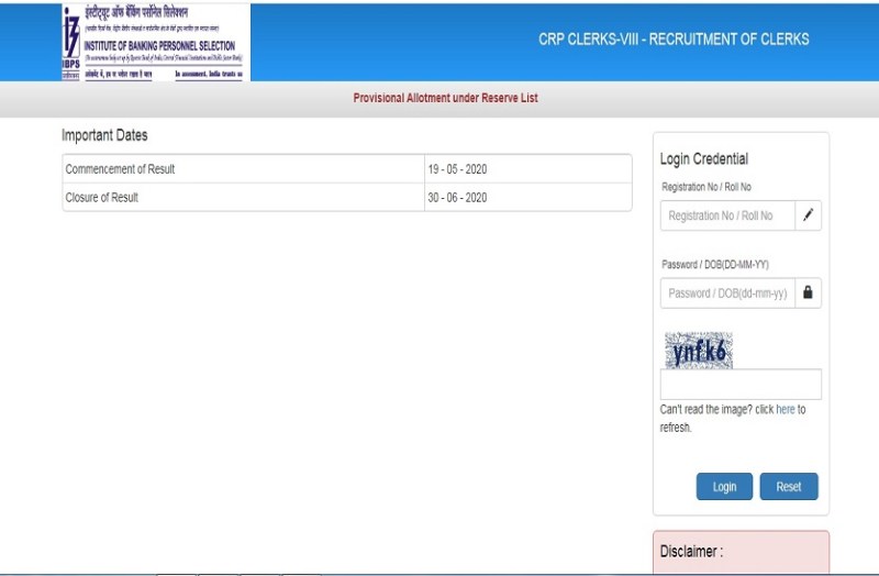 IBPS क्लर्क आरक्षित सूची के तहत अनंतिम आवंटन