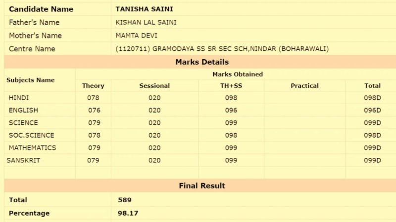 10वीं कक्षा में तनीषा सैनी ने 98.17 प्रतिशत अंक (Tanisha Saini Got 98.17% In RBSE 10th Board) हासिल किए हैं। बता दें, तनीषा के पिता किशन लाल सैनी बस ड्राइवर हैं। उनका कहना है कि तनीषा बहुत लगनशील हैं और उन्होंने उच्च शिक्षा हासिल करने की इच्छा जताई है। यही कारण है कि किशन लाल पूरी शिद्दत से अपनी बच्ची को पढ़ाते हैं। तनीषा बड़े होकर डॉक्टर बनना चाहती हैं।