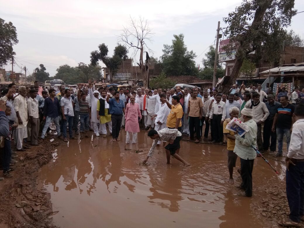 देवतालाब विधानसभा क्षेत्र की मुख्य सडक़ों पर घुंठनेभर गड्ढे जानलेवा गड्ढों में कमल के पौधे रोपकर विरोध जताया