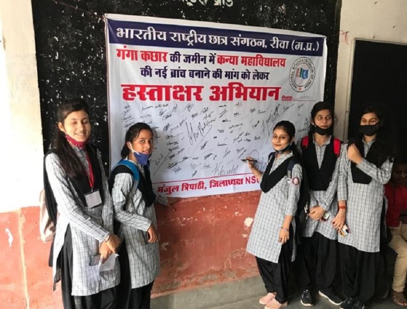 रीवा। भारतीय राष्ट्रीय छात्र संगठन की शहर में कन्या महाविद्यालय की नवीन ब्रांच खोले जाने की मांग को लेकर चलाए गए हस्ताक्षर अभियान में पांचवे दिन 550 से अधिक छात्रों ने हस्ताक्षर कर अपना समर्थन दिया। अब तक शहर के सभी प्रमुख कालेजों के छात्र-छात्राओं ने इस अभियान में हस्ताक्षर कर अपना समर्थन जताया है। शहर में एक ही कन्या महाविद्यालय होने की वजह से यहां पर सभी छात्राओं को प्रवेश नहीं मिल पाता है। इसलिए शहर में एक और कन्या महाविद्यालय की जरूरत है। इस मांग को अब अभियान का रूप मिलता जा रहा है। इस दौरान एनएसयूआई अध्यक्ष मंजुल त्रिपाठी ने कहा कि जिस उत्साह के साथ जिले के छात्र-छात्राएं कन्या महाविद्यालय की ब्रांच खोले जाने का समर्थन खुले मन से दे रहे हैं उससे यह विश्वास है की प्रदेश सरकार छात्रों की मांग को स्वीकार करेगी। यदि मांग नहीं मानी गई तो एनएसयूआई सड़क से सदन तक वरिष्ठ नेताओं के मार्गदर्शन व जिले के छात्र छात्राओं के साथ हर स्तर पर मोर्चा खोलेगी। जलसंसाधन विभाग के गंगा कछार कार्यालय परिसर में नया कन्या महाविद्यालय छात्रों की ओर से प्रस्तावित किया गया है। हस्ताक्षर अभियान के दौरान मुख्य रूप से आदर्श तिवारी, टीआरएस इकाई अध्यक्ष पंकज उपाध्याय, सत्यम मिश्र, अखण्ड सिंह , विनय सोनकर, विशाल कुशवाहा मृगेंद्र सिंह, शिवम मिश्रा, शशिमोल तिवारी ,अनूप तिवारी आदि मौजूद रहे।