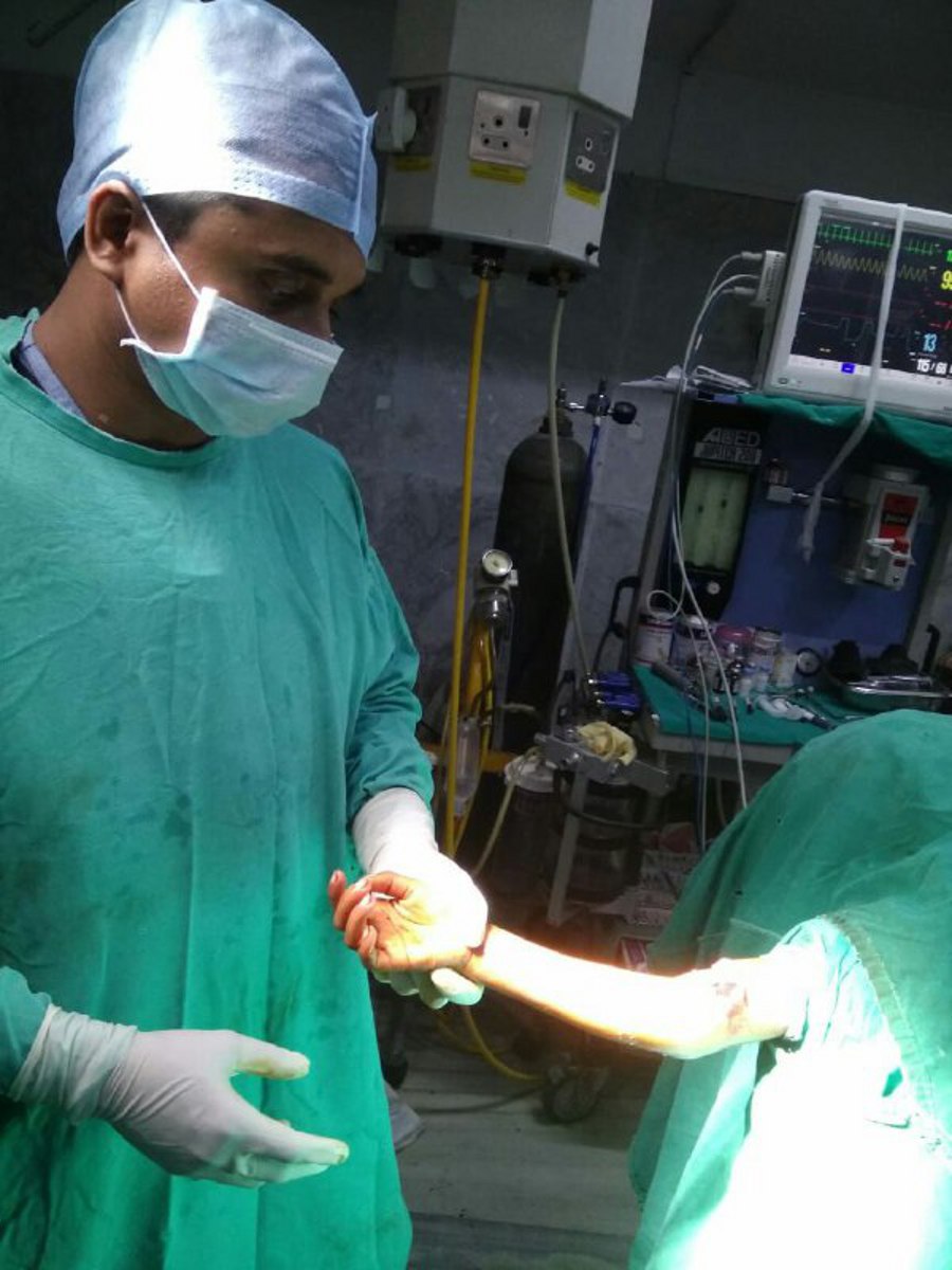 सुबह 8.30 बजे घटी घटना के बाद फौरन परिजनों ने एंबुलेंस बुलाई। संजय गांधी अस्पताल लेकर पहुंचे। स्थिति को गंभीर देखते हुए अस्थि रोग विशेषज्ञ डॉ. बीबी सिंह ने फौरन सर्जरी विभाग के प्लास्टिक सर्जन डॉ. सौरभ सक्सेना से बात की। वह मौके पर पहुंचे। जिसके बाद हड्डी और नस जोडऩे के लिए परिजनों से सर्जरी की सहमति ली गई। एनेस्थीसिया विशेषज्ञ डॉ. सुधाकर द्विवेदी के साथ सर्जरी को डॉक्टरों ने अंजाम दिया। अस्थि रोग विशेषज्ञ ने हड्डी का तार विधि से सर्जरी की तो प्लास्टिक सर्जन ने नस जोडऩे का कार्य किया। करीब डेढ़ घंटे की सर्जरी के बाद जब डॉक्टर ऑपरेशन थियेटर से बाहर निकले तब परिजनों ने चैन की सांस ली।
