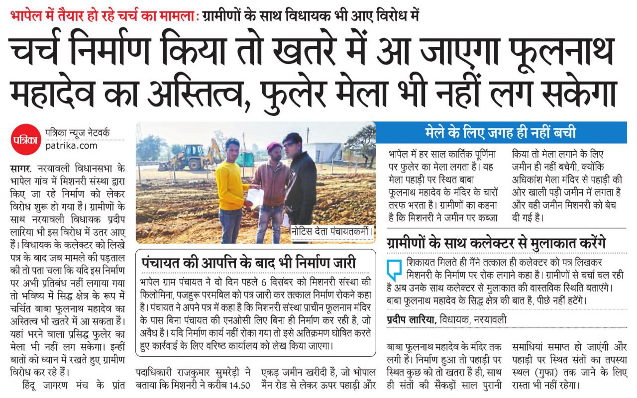 भापेल गांव में बाबा फूलनाथ महादेव का सिद्ध धाम है। यहां आसपास पड़ी खाली जमीन पर हर साल कार्तिक पूर्णिमा से तीन दिन का मेला लगता है। मंदिर को दान में मिली इस जमीन पर कुछ समय पहले मिशनरी संस्था ने निर्माण शुरू कर दिया। इसके बाद ग्रामीणों ने पड़ताल की तो पता चला कि यह जमीन शहर के एक कॉलोनाइजर ने मिशनरी को बेची है, जहां संस्था चर्च सहित अन्य निर्माण कार्य कर रही है। इसके बाद हालही में मिशनरी के निर्माण को रुकवाने नरयावली विधायक प्रदीप लारिया ने कलेक्टर को पत्र लिखा था।