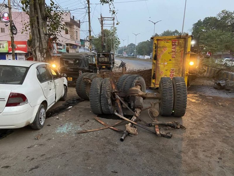 सागर. शहर के बीचों-बीच से गुजरी स्मार्ट रोड-2 पर भारी वाहन मौत बनकर दौड़ रहे हैं। गुरुवार सुबह इसी रफ्तार के कारण एक हादसा हुआ, जिसमें लगभग 100 किलोमीटर प्रति घंटे की रफ्तार से दौड़ रहा मुरम से भरा डंपर तहसीली तिराहे पर डिवाइडर से टकराया और उसके परखच्चे उड़ गए। डंपर की रफ्तार का अंदाजा इसी बात से लगाया जा सकता है कि वह टकराने के बाद ढाई फीट ऊंचे डिवाइडर पर चढ़कर करीब 50 मीटर घिसटता रहा और फिर सड़क पर पलट गया, जिससे उसके आगे से लेकर पीछे तक के सभी 10 पहिए बॉडी से अलग हो गए, वहीं डंपर का डीजल टैंक भी सड़क पर पड़ा मिला। गनीमत रही कि हादसे के दौरान कोई आसपास नहीं था, नहीं तो बड़ा हादसा हो सकता था।