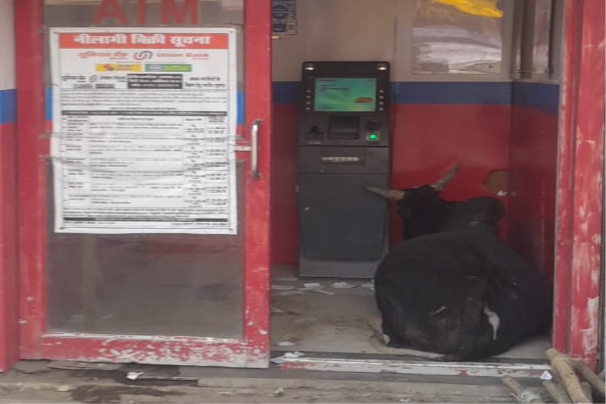 एटीएम बूथ में बैठा सांड