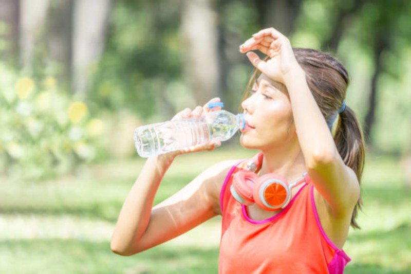 Athlete young beautiful woman drinking water from a plastic bottle at summer green park, Sport woman drinking water after work out exercising
