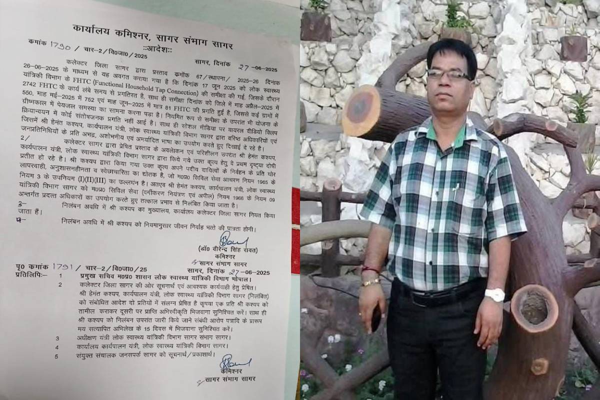 वीडियो सामने आने के कुछ घंटों बाद ही अब कार्यपालन यंत्री हेमंत कश्यप को निलंबित कर दिया गया है। संभागायुक्त कार्यालय से जारी निलंबन आदेश के मुताबिक सागर कलेक्टर संदीप जीआर द्वारा प्रस्ताव के माध्यम से यह बताया गया कि 17 जून को लोक स्वास्थ्य यांत्रिकी विभाग के एफएचटीसी के कार्यों की समीक्षा की गई थी, जिसमें 2742 एफएचटीसी के कार्य लंबे समय से लंबित पाए गए। इस वजह से कई ग्रामों में ग्रीष्मकाल में पेयजल की समस्या का सामना करना पड़ा। लगातार समीक्षा के बाद भी योजना के क्रियान्वयन में कोई संतोषजनक प्रगति नहीं पाई गई। कलेक्टर सागर के प्रस्ताव के अवलोकन के बाद ईई कश्यप को संभागायुक्त वीरेंद्र सिंह रावत ने तत्काल प्रभाव से निलंबित कर कलेक्टर सागर कार्यालय में अटैच कर दिया है।