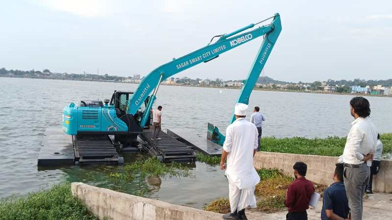 सागर. लाखा बंजारा झील से अब फ्लोटिंग मशीन के जरिए जलकुंभी निकाली जाएगी। शुक्रवार को विधायक शैलेंद्र जैन ने इसका पूजन कर कार्य शुरू कराया। संजय ड्राइव पर शाम साढ़े 5 बजे नवीन एक्सकेबेटर फ्लोटिंग मशीन से जलकुंभी निकालने का काम शुरू हुआ। यह मशीन सागर स्मार्ट सिटी लिमिटेड द्वारा खरीदी गई है। जैन ने बताया कि फ्लोटिंग मशीन झील से जलकुंभी सहित अन्य कचरा आदि झील के पानी पर तैरते हुए निकालने में सक्षम है। 12-14 टन क्षमता वाली इस मशीन की बकेट साइज 4 मीटर क्यूब के हैं। यह मशीन लगभग 2-3 मीटर से अधिक गहराई तक झील से कीचड़, कंकड़ पत्थर आदि निकालने में सक्षम है और अधिक लंबाई का बूम होने के कारण यह मशीन एक ही स्थल पर खड़ी होकर लम्बी दूरी तक साफ-सफाई आदि कार्य कर सकती है। फ्लोटिंग मशीन के शुभारंभ के पूर्व विधायक जैन ने निगमायुक्त राजकुमार खत्री के साथ स्मार्ट सिटी के शेष रह गए विकास कार्यों की समीक्षा भी की और जिम्मेदारों को जल्द से जल्द कार्य पूर्ण करने के निर्देश दिए।