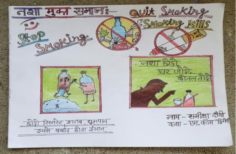 छात्राओं को संदेश देते हुए प्राचार्य डॉ. चंदा रत्नाकर ने कहा कि यदि हमारा सामाजिक वातावरण नशा मुक्त हो जाता है तो आज का एक-एक नागरिक स्वच्छ एवं स्वस्थ वातावरण में अपना जीवन यापन करेगा। इसके लिए जरूरी है शराबबंदी, नशीले पदार्थों के सेवन पर प्रतिबंध, युवा वर्ग को नशे के दुष्परिणामों से अवगत कराना और नशीली वस्तु के सेवन व प्रचार-प्रसार के विरोध में समाज का विशेषकर महिलाओं का संगठित होना। प्रभारी डॉ. उमा लवानिया ने कहा कि युवा पीढ़ी में नशे का बढ़ता चलन गंभीर चिंता का विषय है। नशा स्वयं तो एक सामाजिक समस्या है ही तथा इसका सेवन करने से समाज में और अन्य नई समस्याएं जन्म ले लेती हैं। सभी को इसका विरोध अपने-अपने घरों से ही प्रारंभ करना चाहिए। सहयोगी डॉ. निशा जैन ने कहा कि सभी छात्राओं ने अपने-अपने पोस्टर के माध्यम से तंबाकू को कहें न, नशीले पदार्थों से दूर रहो, पीते आप सिगरेट, सिगरेट आपको पीती, बोतल छोडि़ए घर जोडि़ए आदि संदेशों के माध्यम से समाज को एक ऐसा संदेश देने का प्रयास किया है। प्रतियोगिता में प्रथम समीक्षा दांगी, अंजलि दांगी, रोशनी अहिरवार, द्वितीय शालू ठाकुर, अंजलि तिवारी, तृतीय स्थान रेणुका लिटोरिया, नंदिनी मुडोतिया ने प्राप्त किया।