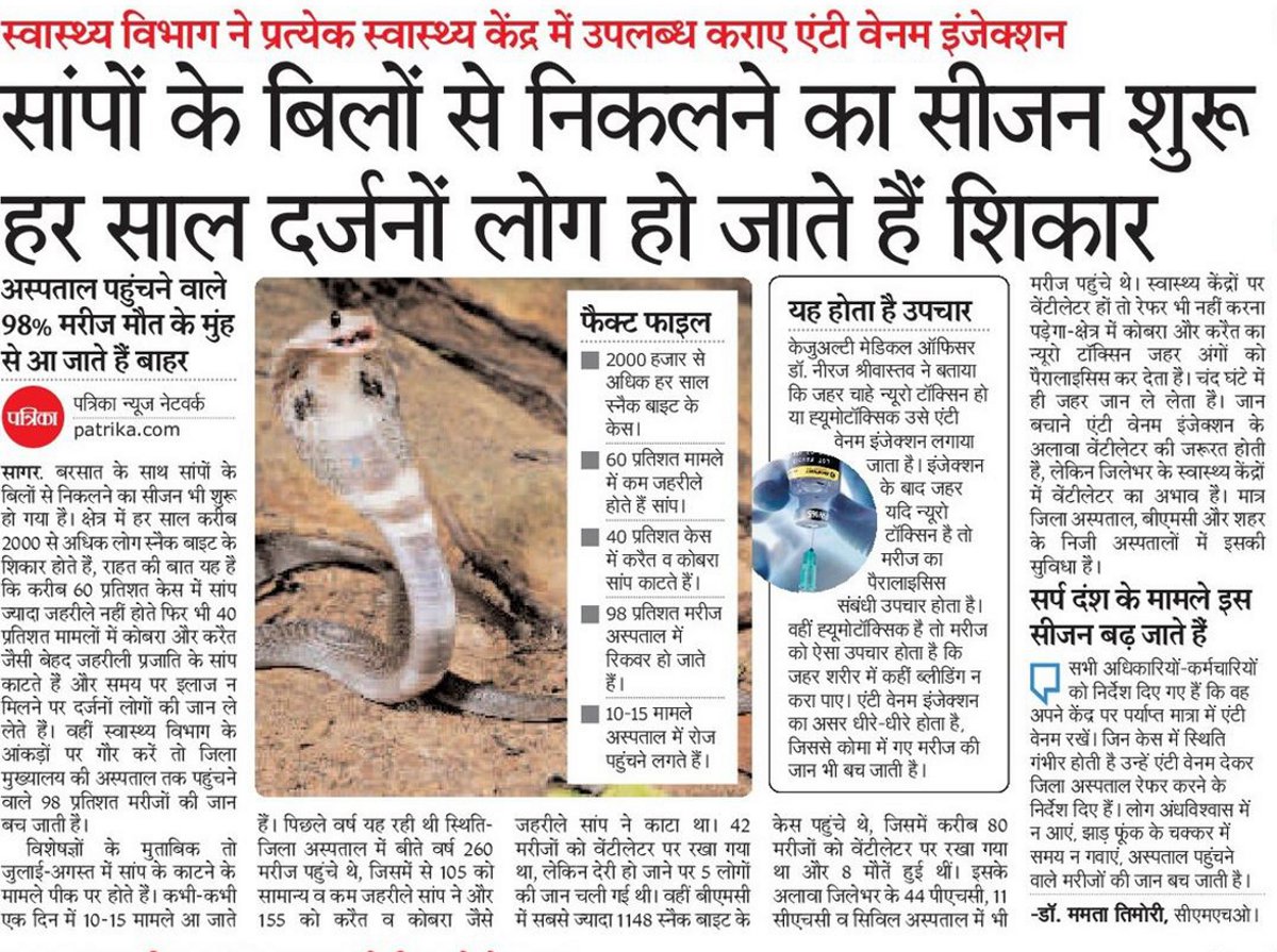 सागर. बारिश के साथ जिले में सांपों के बिलों से निकलने का सीजन भी शुरू हो गया है। क्षेत्र में हर साल 2 हजार से अधिक लोग सर्प दंश का शिकार होते हैं, दर्जनों लोग समय से अस्पताल नहीं पहुंचते और उनकी मौत हो जाती है। क्षेत्र में सर्प दंश की समस्या को लेकर पत्रिका ने सोमवार को प्रमुखता से खबर का प्रकाशन किया था। खबर के बाद मंगलवार को कलेक्टर संदीप जीआर के निर्देश पर एडवाइजरी जारी की है। सर्प दंश को स्थानीय आपदा घोषित किया गया है। जारी एडवाइजरी में कहा है कि बारिश में सर्प दंश की रोकथाम के लिए एक बहुआयामी रणनीति तैयार की है, जिसमें जनजागरूकता, आपातकालीन सेवाओं का सुदृढ़ीकरण और निवारण संबंधी उपाय शामिल किए गए हैं। इस अभियान के तहत ग्राम पंचायत और शहरी वार्ड स्तर पर स्वयं सेवी संस्थाओं के माध्यम से विशेष कार्यक्रम आयोजित किए जाएंगे। सोशल मीडिया, रेडियो, होर्डिंग्स और प्रिंट मीडिया के जरिए सर्पदंश से बचाव और प्राथमिक उपचार की जानकारी प्रसारित की जाएगी। स्कूलों और कॉलेजों में विशेष सत्र आयोजित कर विद्यार्थियों को इस खतरे और उससे बचाव के उपायों के बारे में शिक्षित किया जाएगा।