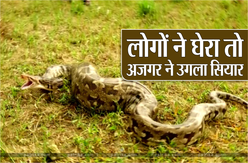 अजगर को देखकर पूरे इलाके में सनसनी फैल गई। अजगर हिल नहीं पा रहा था बताया जा रहा है कि वह एक सियार को निगल गया था। लोगों की बढ़ती संख्या के चलते चहल पहल बढ़ी तो अजगर ने सियार को उगलना शुरू कर दिया।