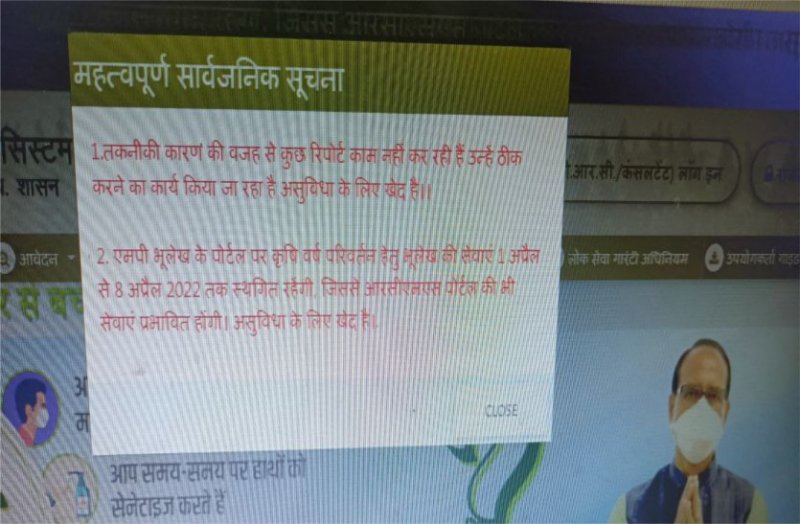 अब पोर्टल पर आने लगी सूचनाआरसीएमएस पोर्टल बंद होने की समस्या अकेले सागर जिले तक ही सीमित नहीं है बल्कि पूरे प्रदेश में राजस्व संबंधी कार्य अटके हैं। आरसीएमएस पोर्टल पर अब विभाग की ओर से समस्या को लेकर सूचना भी आने लगी है और बताया जा रहा है कि 1 से 8 अप्रेल तक यह समस्या रहेगी। 9 अप्रेल से आरसीएमएस, वेब जीआइएस समेत अन्य पर ऑनलाइन कार्य शुरू हो जाएगा।