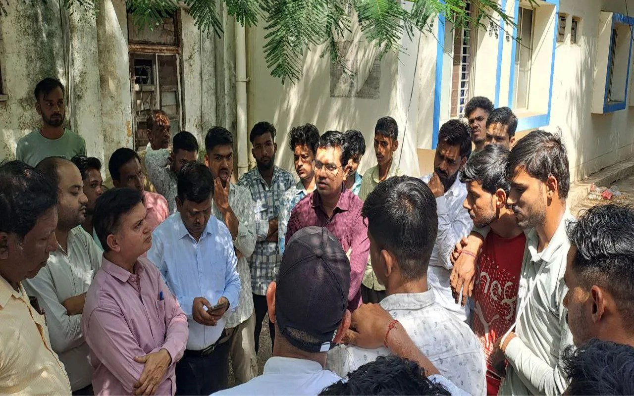 कर्मचारियों से चर्चा करते हुए अधिकारी