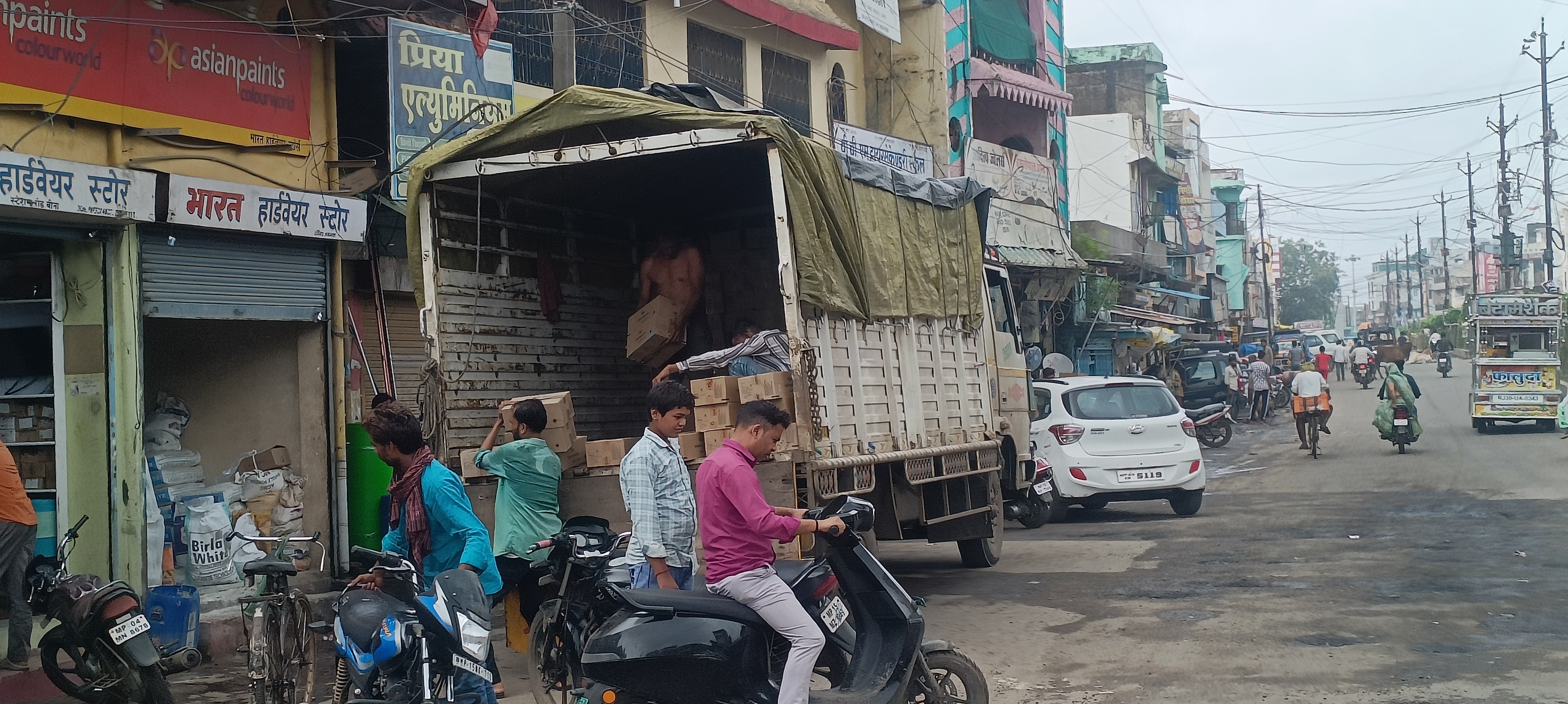 स्टेशन रोड पर सड़क किनारे खड़े वाहन से होती हुई अनलोडिंग