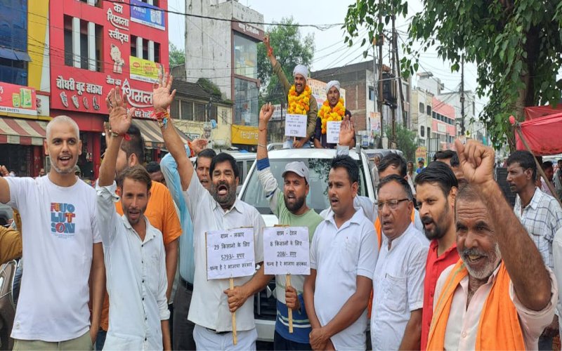 किसान उदय सिंह, वीरेन्द्र ठाकुर की प्रीमियम राशि ज्यादा कटी है और बीमा राशि उससे भी कम आई है, इसलिए इन दोनों किसानों को माला पहनाकर कार में बैठाया गया। साथ ही वह हाथों में तख्ती लिए थे, जिसपर प्रीमियम और बीमा राशि लिखी थी। स्टेशन रोड से जुलूस सर्वोदय चौराहे पहुंचा, जहां प्रदर्शन किया गया। किसान नेता इंदर सिंह ने कहा कि 8 किसानों को 208 रुपए की राशि दी गई है और इतनी कम राशि देकर भाजपा ने किसानों का अपमान किया है। जबकि प्रीमियम कई गुना ज्यादा काटा गया है। इसलिए राशि कम मिलने वाले किसानों के सम्मान में यह जुलूस निकाला गया। उन्होंने केन्द्र और राज्य सरकार पर निशाना साधते हुए कहा कि दोनों सरकारें ही किसान विरोधी हैं, जिससे किसान परेशान हैं। फसलें बर्बाद होने पर भी उन्हें बीमा राशि नहीं दी जा रही है। विधायक ने भी कांग्रेस पार्टी छोडकऱ भाजपा में जाते समय कहा था कि वह किसानों के हित में कांग्रेस छोड़ रही हैं, लेकिन वह भी बीमा राशि नहीं दिला पाईं। इस अवसर पर श्याम व्यास, कल्यान सिंह, मोतीलाल, राजकुमार, जाहर सिंह, वीरन पटेल, रवि, जसवंत सिंह आदि उपस्थित थे।