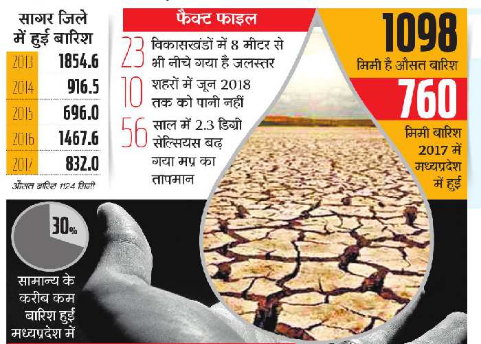 सागर शहर में अब तक कुल 832 मिमी बारिश हुई है, जो सामान्य से 292 मिमी कम है। बारिश की कमी ने किसानों की कमर तोडक़र रख दी है। संभाग में भू-जलस्तर तेजी से नीचे गिर रहा है। अभी यह आंकड़ा अलग-अलग क्षेत्रों में 2 से 4 मीटर पर पहुंच गया है।