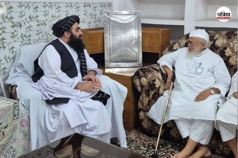 देवबंद दारुल उलूम के मोहतमिम अबुल कासिम नोमानी से बात करते अफगानिस्तान के विदेश मंत्री आमिर खान मुत्तकी