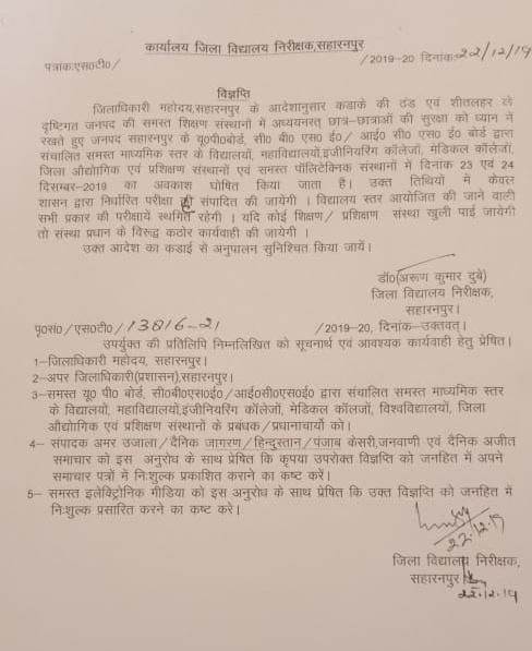 जिलाधिकारी ( डीएम सहारनपुर ) आलोक कुमार की ओर से जारी आदेशों के अनुपालन में जिला विद्यालय निरीक्षक की ओर से सभी तरह के शिक्षण संस्थानों को यह आदेश जारी करा दिए गए हैं। जारी निर्देशों में साफ कह दिया गया है कि यदि 23 और 24 दिसंबर को छुट्टी होने के बावजूद कोई भी शिक्षण संस्थान खुला हुआ मिलता है तो शिक्षण संस्थान के जिम्मेदार व्यक्ति के खिलाफ कार्रवाई की जाएगी। यह अलग बात है कि जिलाधिकारी की ओर से जारी आदेशों में ठंड को देखते हुए छुट्टी कर दिए जाने की घोषणा की गई है लेकिन चर्चाएं हैं कि सीए को लेकर चल रहे विरोध प्रदर्शन के बीच प्रशासन ने स्कूली बच्चों की सुरक्षा दृष्टि के नजर छुट्टियां बढ़ाई हैं।
