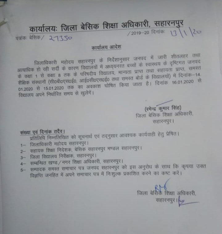 सहारनपुर। शीत लहरों और कड़ाके की ठंड के बीच सहारनपुर के लोगों के लिए राहत देने वाली खबर है। शीत लहरों को देखते हुए सहारनपुर जिलाधिकारी ( DM Order ) ने कक्षा 1 से लेकर कक्षा 8 तक केस्कूलों की छुट्टी के आदेश जारी कर दिए हैं।