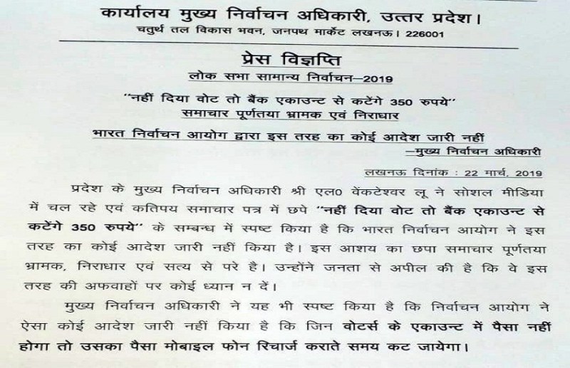 दरअसल लाेकसभा चुनाव 2019 काे लेकर साेशल मीडिया के वाट्सएेप, फेसबुक आैर टेलीग्राम समेत अन्य प्लेटफार्म पर एक खबर तेजी के साथ वायरल की जा रही है। इस खबर में कहा गया है कि यदि आप वाेट नहीं करते हैं ताे आपके बैंक एकाउंट से 350 रुपये काट लिए जाएंगे। इस खबर में यह भी लिखा गया है कि एेसा आपके बैंक एकाउंट से लिंक आपके आधार कार्ड के नंबर से हाेगा। यह खबर साेशल मीडिया पर इतनी तेजी से फैली कि खुद चुनाव आयाेग काे इस खबर का संज्ञान लेना पड़ा। 22 मार्च काे चुनाव आयाेग ने एक प्रेस नाेट जारी करते हुए कहा है कि यह खबर बिल्कुल तथ्यहीन है आैर इस तरह की काेई भी कटाैती नहीं की जाएगी।