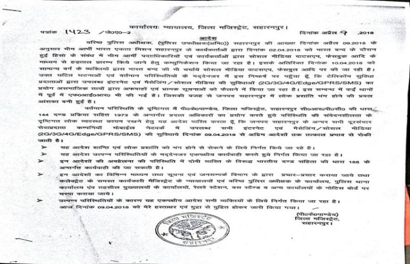 दरअसल 2 अप्रैल कि भारत बंद के दौरान हुई हिंसा के संबंध में भीम आर्मी के पदाधिकारियों और कार्यकर्ताओं की ओर से सोशल मीडिया वाट्सऐप व फेसबुक आदि के माध्यम से हड़ताल की कॉल की जा रही है। लोगों को एकत्र करने की कोशिश की जा रही है और इसके लिए सोशल मीडिया का सहारा लिया जा रहा है। इसके अलावा मंगलवार यानी 10 अप्रैल को सामान्य वर्ग के लोगों द्वारा भारत बंद की चर्चाएं भी सोशल मीडिया पर फैलाई जा रही हैं, जो भ्रामक हैं। इसी को देखते हुए डीएम पीके पांडे ने टेलीकॉम कंपनियां को सहारनपुर में इंटरनेट सेवा बंद रखने के निर्देश जारी किए है। डीएम ने कहा वर्तमान हालातों में जिस तरह से सोशल मीडिया पर भ्रामक सूचनाएं फैलाई जा रही हैं। लोगों को गलत तरीके से एकजुट किया जा रहा है। उससे सहारनपुर जनपद में शांति भंग होने की आशंका हैं। ऐसे में इंटरनेट सेवाओं को बंद किया जाना जरुरी है।
