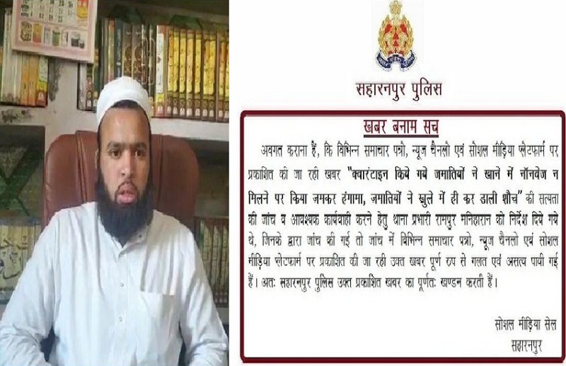 देवबन्द. देश में तेजी से बढ़ रहे कोरोना के मामले के बीच दिल्ली के मरकज में फंसे हजारों जमातियों का मामला सामने आने के बाद लगातार तब्लीगी जमात और जमातियों की खबरें आ रही हैं। मुख्य धारा की मीडिया से लेकर सोशल मीडिया तक पर क्वारंटीन में भर्ती किए गए देशी-विदेशी जमातियों को लेकर तरह-तरह की खबरें चलाने और प्रकाशित करने का सिलसिला जारी है। ऐसी ही एक खबर सहारनपुर से आई थी कि वहां पर क्वारंटीन में रखे गए जमाती स्टाफ वर्स से बदतमीजी कर रहे हैं और खाने में बिरयानी की मांग कर रहे हैं। इन खबरों में कहा गया था कि नॉनवेज नहीं मिलने पर जमातियों ने खाना फेंक दिया। इसके अलावा जमातियों पर खुले में शौच करने का भी आरोप लगाया गया था। बाद में इन आरोपों की जांच जिला प्रशासन की ओर से थाना रामपुर मनिहारान के थानाध्यक्ष को सौंपी गई। इस जांच में पुलिस ने पाया कि जमातियों के खिलाफ जिस तरह की खबरें आ रहीं हैं। वह सरासर झूठ है। जांच के बाद पुलिस ने इन खबरों का खंडन करते हुए बाकायदा सोशल मीडिया पर खबर बनाम सच के नाम से एक प्रेस रीलीज जारी किया। इस में जमातियों के खिलाफ चलाई गई खबरों को झूठ बताने के साथ ही पुलिस ने पत्रकारों, मीडिया और सोशल मीडिया यूजर्स को ऐसी अफवाहें फैलाने से बचने की अपील की है।