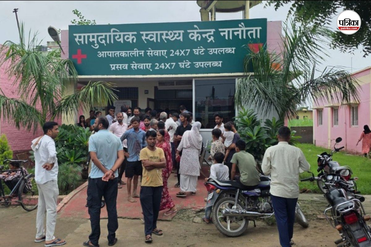 घायल को अस्पताल लेकर पहुंचे परिजन और बाहर खड़े ग्रामीण