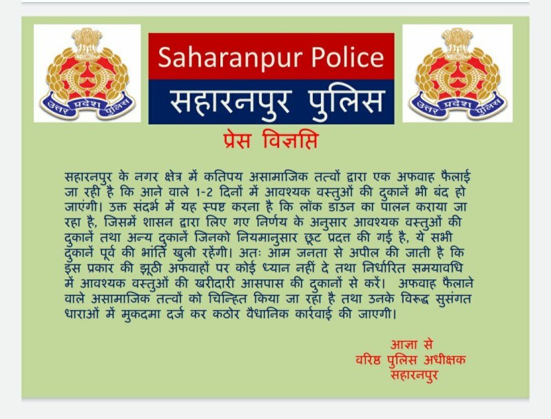 कुछ असामाजिक तत्व लोगों को परेशान करने की नीयत से इस तरह की अफवाहें फैला रहे हैं। एसएसपी ( saharanpur ssp) दिनेश कुमार पीने यह भी कहा है कि ऐसे लोगों को हम (saharanpur police) चिन्हित कर रही है। ऐसे लाेगाें के खिलाफ कड़ी कार्रवाई की जाएगी। फिलहाल पुलिस जनता के सहयोग में खड़ी है। उन्हाेंने लोगों से यह अपील की है कि वह अपने आसपास की दुकानों से ही खरीदारी करें। किसी भी तरह की दुकानों को अनावश्यक रूप से बंद नहीं कराया जा रहा है। जिलाधिकारी ( DM Saharanpur ) की ओर से जो निर्देश जारी किए गए हैं उन्हीं के अनुरूप दुकानें खुलेंगी।