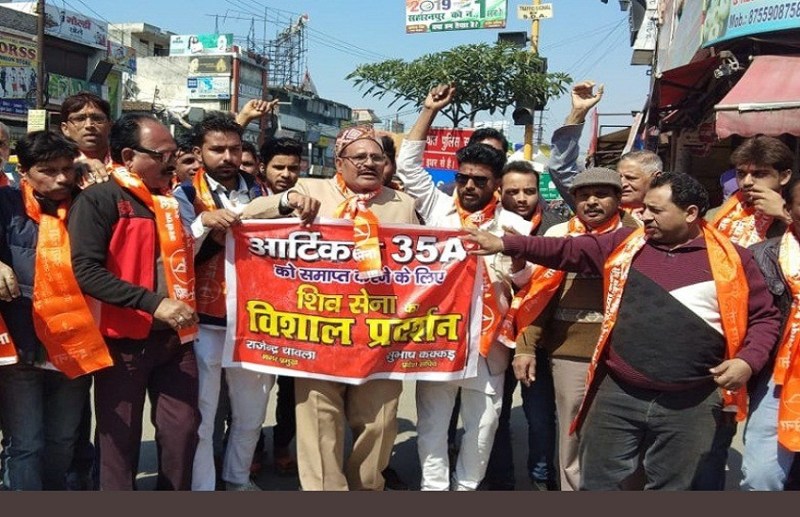 सहारनपुर। कश्मीर में आर्टिकल 35a के खिलाफ शिवसैनिकों ने आस्तीनें चढ़ा ली हैं। गुस्साए शिव सैनिकों ने कलेक्ट्रेट तिराहे पर इकट्ठा होकर जोरदार प्रदर्शन किया और साफ कह दिया कि कश्मीर से आर्टिकल 35a को समाप्त किया जाए।