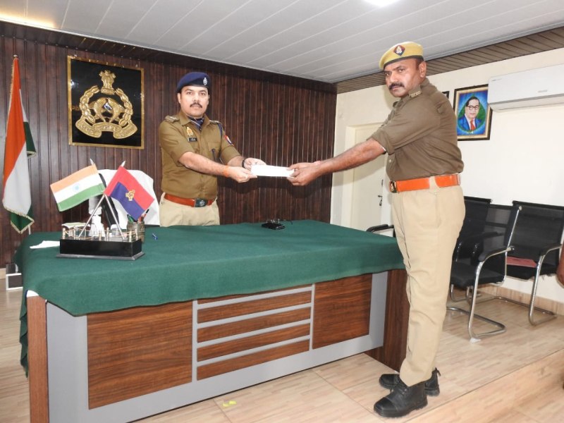 होमगार्ड राजवीर को सम्मानित करते वरिष्ठ पुलिस अधीक्षक डॉक्टर विपिन ताडा