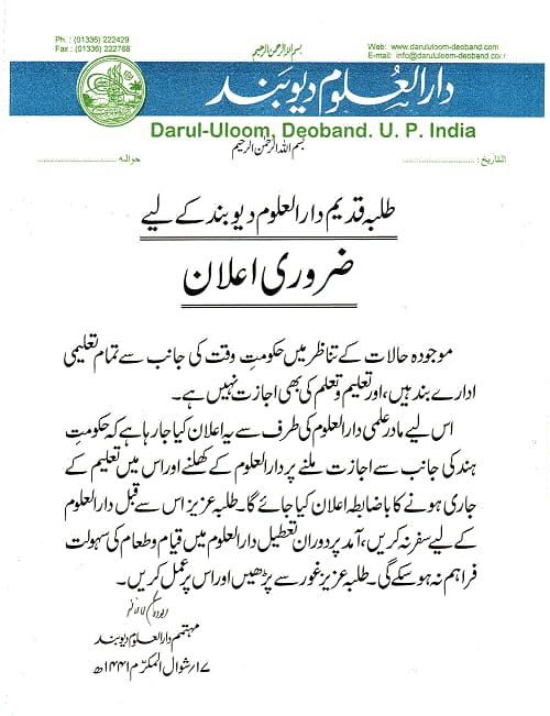 दारुल उलूम देवबन्द ( deoband darul ullom ) के मोहतमिम मौलाना मुफ्ती अबुल कासिम नोमानी ने छात्रों के लिये संस्थान में एक एलान चस्पा कराया है। इस एलान में साफ तौर से कहा गया है कि वैश्विक महामारी कोरोना के चलते सरकार ने सभी शिक्षण संस्थानों को बंद किया हुआ है। अगले आदेशों तक सभी शिक्षण संस्थान बंद हैं। इसलिए दारुल उलूम में भी किसी भी तरह की गतिविधियों पर पूरी तरह पाबंदी है।