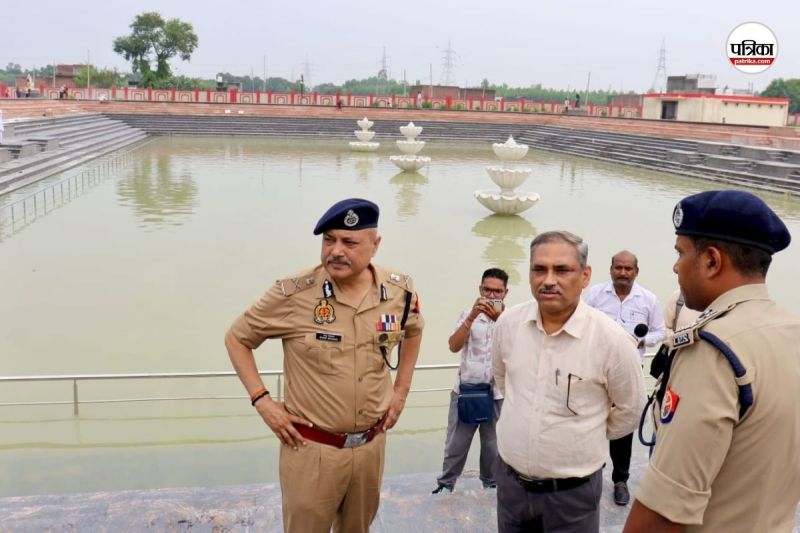सीएम के पहुंचने से पहले म्हाड़ी स्थल पर बनाए गए सरोवर का निरीक्षण करते पुलिस और प्रशासनिक अधिकारी