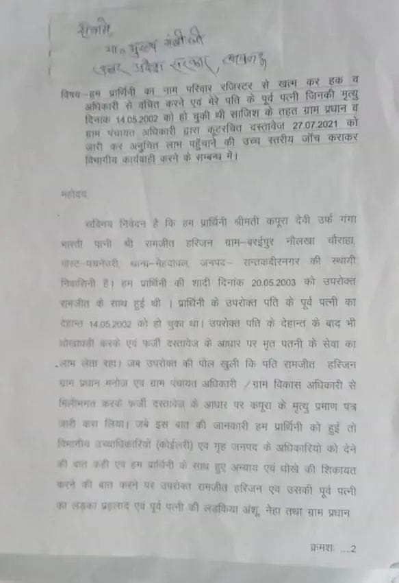 SantKabirNagar : जिले से हैरान कर देने वाला एक मामला सामने आया है। यहां एक जिंदा पत्नी सरकारी कागजों में मृत दिखा दी गई है। कागजों में मृत महिला जिंदा है और अपने जिंदा होने की सबूत देने के साथ ही न्याय पाने के लिए अपने बच्चियों के साथ कपूरी देवी उर्फ गंगा भारती दर-दर भटक रही है। मामला मेहदावल तहसील क्षेत्र के ग्राम बरईपुर नौलखा गांव का है। जहां के रामजीत हरिजन ने सन 2003 में गोरखपुर के निवासी कपूरी देवी उर्फ गंगा भारती के साथ शादी की थी और उसे दो बच्चियों के साथ घर से निकाल दिया। घर से बेघर हुई पीड़ित महिला सरकारी दस्तावेजों में जिंदा होने की गुहार लग रही है। लेकिन उसे वर्षों से सिर्फ मिल रहा तो आश्वासन। महिला ने सीएम योगी आदित्यनाथ को पत्र लिखकर न्याय की गुहार लगाई है।