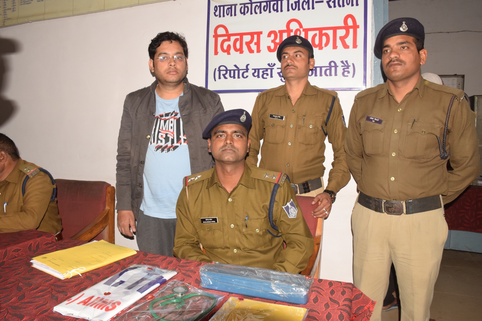 निरीक्षक मोहित सक्सेना के निर्देश पर एसआइ शैलेन्द्र पटेल ने प्रधान आरक्षक देवनारायण उपाध्याय, साइबर सेल के प्रधान आरक्षक दीपेश पटेल, आरक्षक कमलाकर सिंह, विपिन सोंधिया, संजय मिश्रा की मदद से आरोपी कथित डॉक्टर को गिरफ्तार कर डॉक्टर अनुराग त्रिपाठी के नाम का बैनर, लेटर पैड, बीपी चेक करने की मशीन, स्टैथौस्कोप, एमबीबीएस व एमएस की फर्जी सर्टिफिकेट व लोन के दस्तावेज जब्त किए हैं।