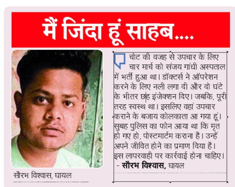 चोट की वजह से उपचार के लिए संजयगांधी अस्पताल में चार मार्च को भर्ती हुआ था। डाक्टर्स ने ऑपरेशन करने के लिए नली लगा दी और दो घंटे के भीतर छह इंजेक्शन दिए। जबकि, पूरी तरह स्वस्थ था। इसलिए वहां पर उपचार कराने की बजाय कोलकाता आ गया हूं। सुबह पुलिस का फोन आया था कि मृत हो गए हो, पोस्टमार्टम कराना है। उन्हें अपने जीवित होने का प्रमाण दिया है। इस लापरवाही पर कार्रवाई होना चाहिए।