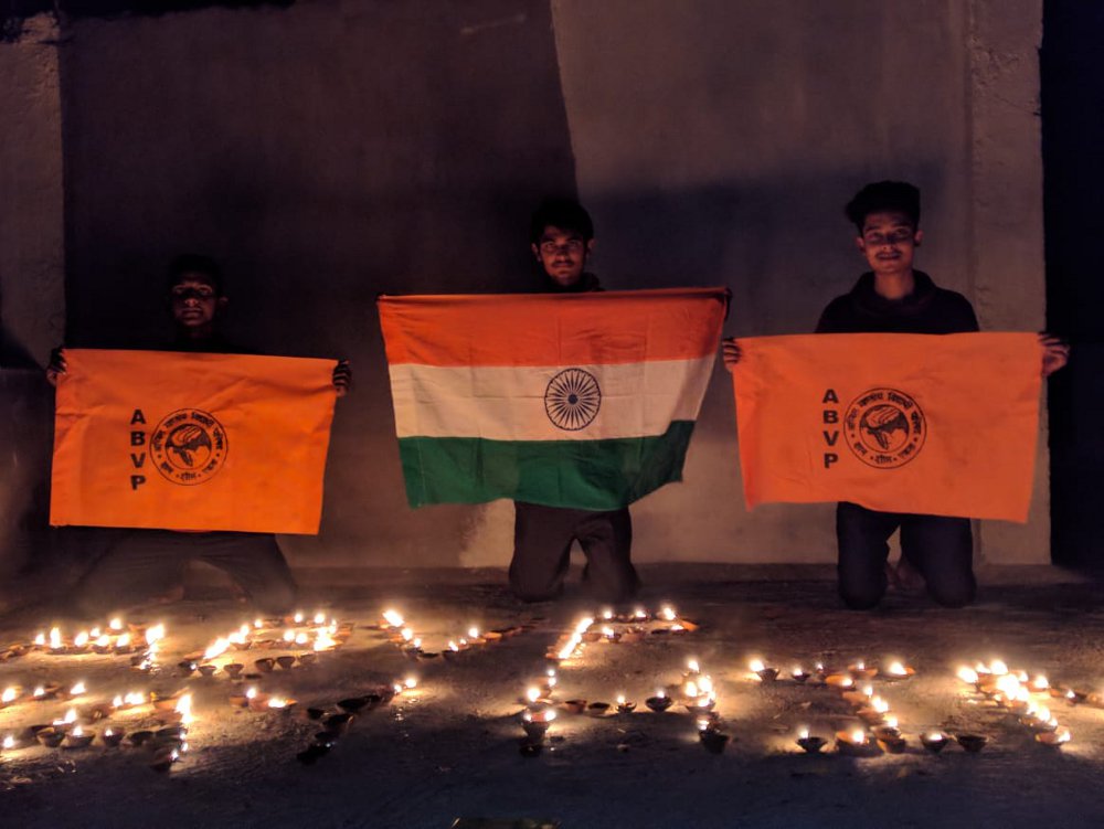 सतना. जम्मू-कश्मीर के हंदवाड़ा में सोमवार की देर शाम आतंकवादियों के हमले में शहीद हुए सीआरपीएफ जवानों को गुरुवार की संध्या काल में अभाविप चित्रकूट महाकौशल प्रांत द्वारा श्रद्धांजलि दी गई। वीर जवानों की शहादत पर मिट्टी के दीये जलाकर श्रद्धा सुमर अर्पित किया गया। साथ ही भारत माता के नारे लगाकर 2 मिनट का मौन रख कर नमन किया। श्रद्धांजलि सभा में अभाविप विश्वविद्यालय अध्यक्ष ओमराज तिवारी, सह मंत्री सत्यम मिश्रा, सह मंत्री धीरेन्द्र त्रिपाठी, सोमेध मिश्रा, कंचन गुप्ता आदि उपस्थित रहीं।