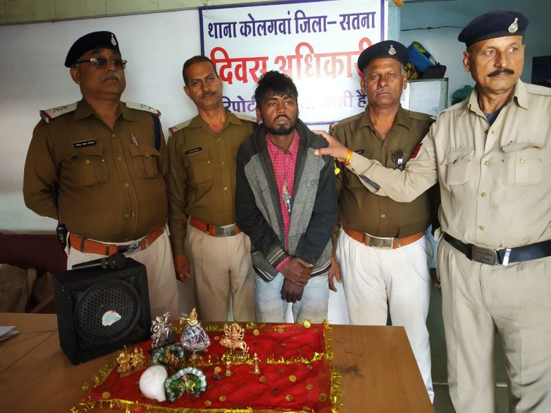 सतना. कोलगंवा थाना पुलिस ने मंदिर में चोरी के इल्जाम में एक युवक को गिरफ्तार किया है। इसके कब्जे से अलग- अलग धातुओं की 10 मूर्तियां बरामद की गई हैं। यह मूर्तियां चांदी, पीतल एवं तांबे की बताई गई हैं। आरोपी चोर को पकडऩे में एएसआई भीमसेन उपाध्याय की अहम भूमिका रही है। एएसआइ उपाध्याय ने बताया कि 6 जनवरी सोमवार की सुबह सूचना मिली थी कि बांधवगढ़ कॉलोनी में एमआइजी नंबर एक के पास स्थित मां दुर्गा के मंदिर में चोरी हो गई है। जानकारी मिलने पर जब घटनास्थल का निरीक्षण किया गया तो मंदिर के बगल में स्थित एक दुकान से सीसीटीवी कैमरे की रिकॉर्डिंग प्राप्त हुई। रिकॉर्डिंग में दिखाई देने वाले शख्स की जब पहचान शुरू की गई तो पता चला कि वह गहरा नाला सिंधी कैंप इलाके में रहने वाला दीपक यादव है। इसकी तलाश के लिए मुखबिर लगाए गए और अंतत: सोमवार की रात करीब साढ़े 9 बजे यह गहरा नाला सिंधी कैंप में मिल गया। हिरासत में लेकर जब इससे पूछताछ की गई तो इसने मंदिर से चोरी किया गया सारा सामान बरामद करा दिया।
