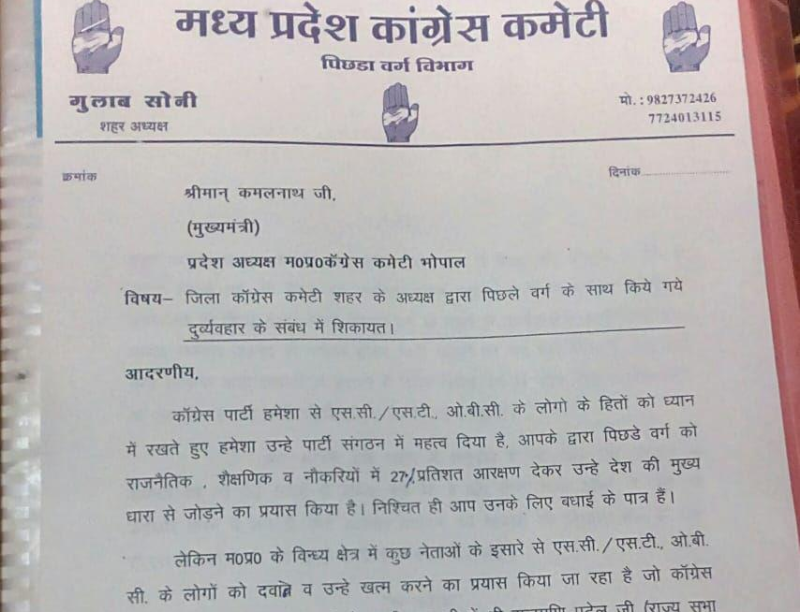 मिली जानकारी के अनुसार पिछड़ा वर्ग शहर अध्यक्ष गुलाब सोनी ने मुख्यमंत्री को लिखे पत्र में बताया है कि कांग्रेस पार्टी हमेशा से एससी एसटी और ओबीसी के हितों को ध्यान में रखते हुए संगठन में हमेशा महत्व दिया है। खुद मुख्यमंत्री ने राजनीतिक, शैक्षणिक व नौकरियों में 27 प्रतिशत आरक्षण देकर उन्हें मुख्य धारा से जोड़ने का प्रयास किया है। लेकिन विन्ध्य क्षेत्र में कुछ नेताओं के इशारे पर एससी एसटी और ओबीसी लोगों को दबाने और उनका नेतृत्व खत्म करने का प्रयास किया जा रहा है। जो कांग्रेस पार्टी के लिए अच्छा संकेत नहीं है।