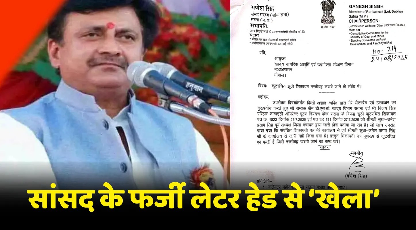 जांच शुरू होने पर सांसद के लेटरहेड के दुरुपयोग का मामला सामने आया। सांसद गणेश सिंह ने अपने लेटर हेड में 24 अगस्त 2025 को पत्र क्रमांक 214 में आयुक्त, खाद्य नागरिक को पत्र लिखकर कहा कि उनके लेटरहेड और हस्ताक्षर का दुरुपयोग कर डीएसओ सम्यक जैन और विजय सिंह के खिलाफ फर्जी शिकायत की गई। उन्होंने सुधा उमेश प्रताप सिंह के पत्र को भी कूटरचित बताते हुए दोनों पत्रों को नस्तीबद्ध करने की मांग की। इस पत्र की प्रति कलेक्टर को भी दी गई।
