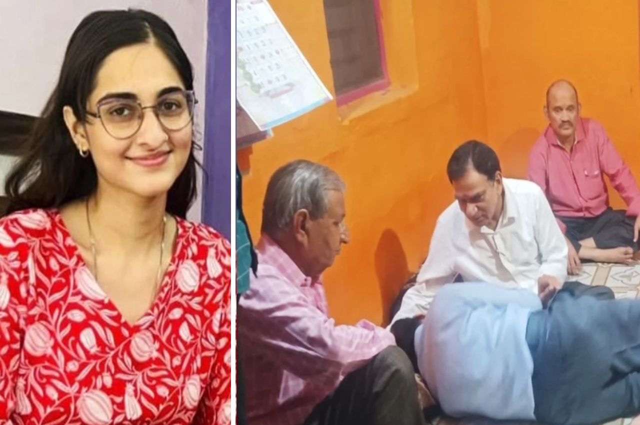 बाएं से मृतक सृष्टि (22) तथा इकलौती बेटी की मौत की खबर से बार-बार बेसुध होते पिता को ढांढस बंधाते लोग.
