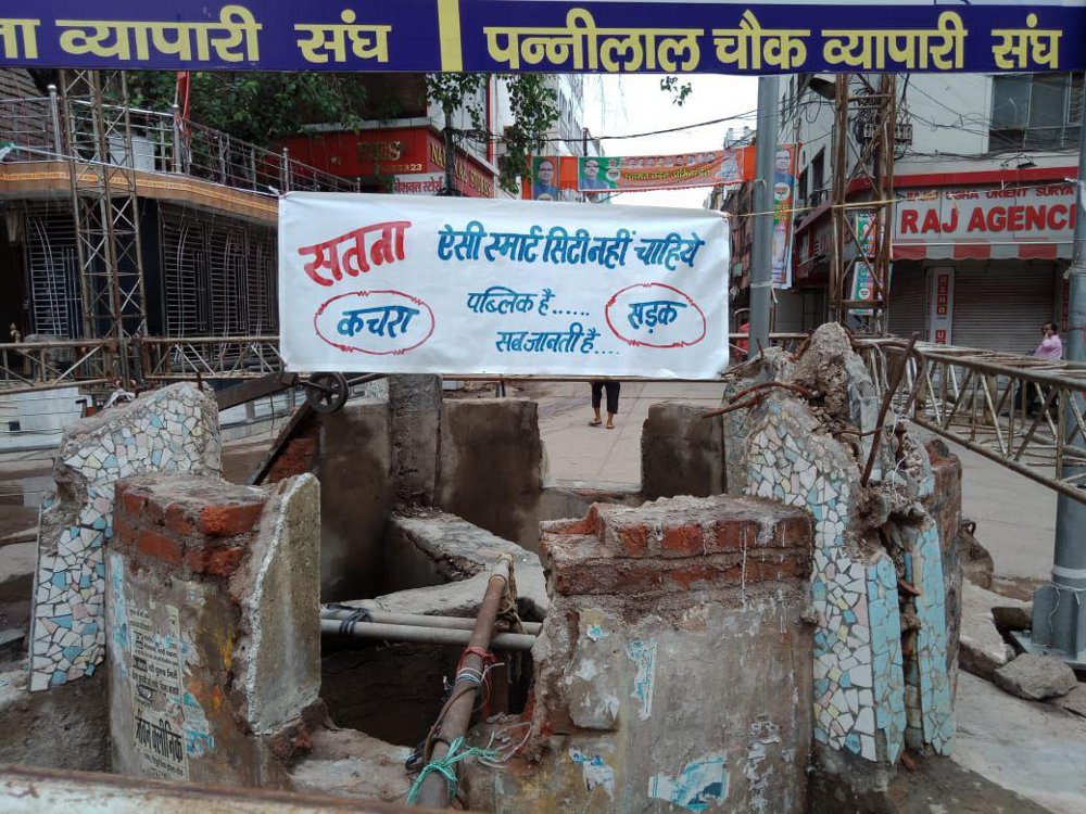 टूटी सड़क और गंदगी से परेशान व्यापारियों द्वारा लगाया गया ये बैनर सोशल मीडिया में खूब वायरल हो रहा है। पन्नीलाल चौक व्यापारी संघ लिखे बैनर में ऐसी स्मार्ट सिटी नहीं चाहिए, पब्लिक है सब जानती है कचरा... सड़क... इस तरह के स्लोगन लिखे गए है। ये वायरल फोटो जब भाजपा नेताओं के पास पहुंची तो सब चित्त हो गए।